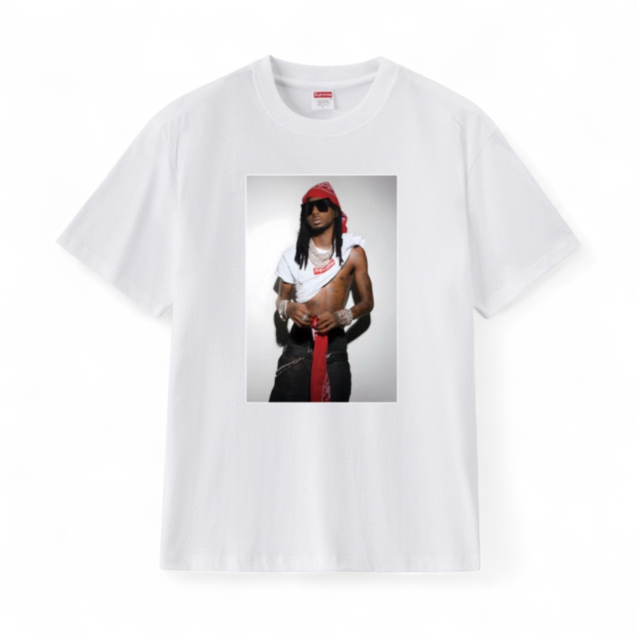 Introducing the Supreme x Playboi Carti T-Shirt ‘White’. This limited edition collaboration features a clean white design with the iconic Supreme logo and Playboi Carti's graphics. Made with high-quality materials, this t-shirt provides both style and comfort. Elevate your streetwear game with this exclusive piece.